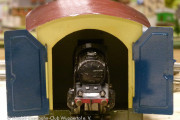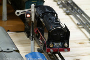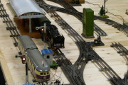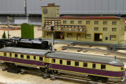Die hier ausgestellte Modellbahn aus Privatbesitz repräsentiert genau diese Zeit der 30er Jahre mit Modellen des „Fliegenden Hamburgers“, dem damals modernen Hafenbahnhof Friedrichshafen oder der Dampflok 01. Betrieben wird sie als Gleich- und Wechselstrombahn, denn Märklin hatte tatsächlich Mitte der 30er Jahre zwei Jahre lang auch Gleichstromloks im Programm. Mit einem zwischengeschalteten Gleichrichter und einem Gleichrichter in der Lok war man in der Lage, ein „Zweizugsystem“ zu fahren und gleichzeitig vom Fahrpult aus die Fahrtrichtung zu wechseln. Weichen und Signale sind fernbedient und die Signale weisen Zugbeeinflussung durch Stoppstellen auf.