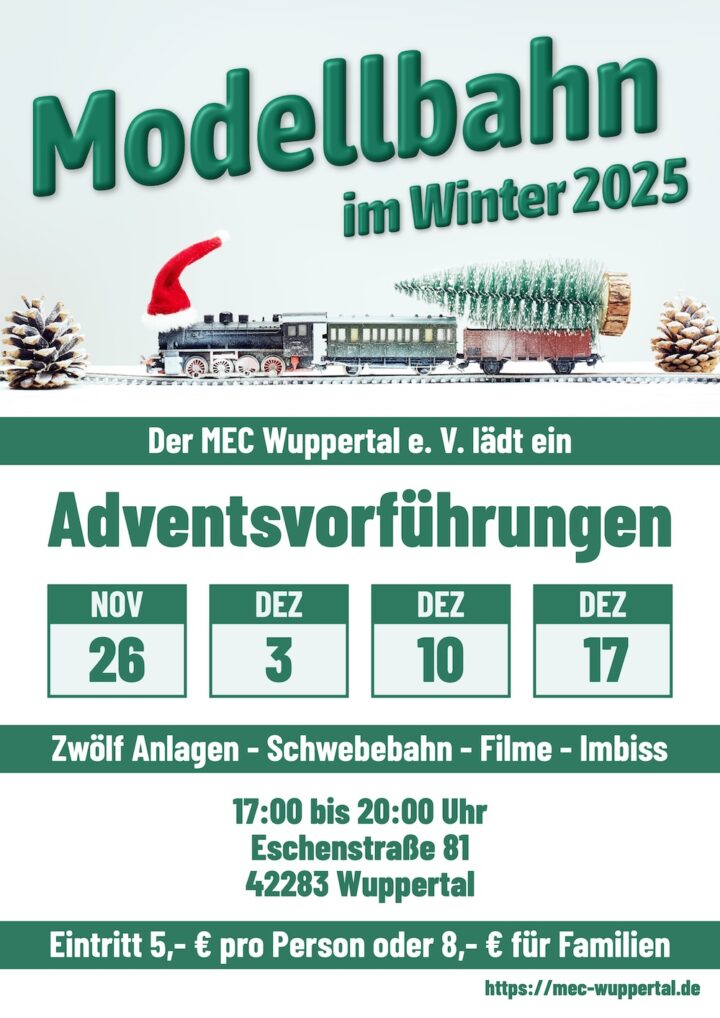 Ja, es ist mal wieder so weit. Das Jahr neigt sich ganz langsam dem Ende zu, und es wird Zeit, unsere Advents-Termine bekannt zu geben. Freuen Sie sich auch 2014 auf vorweihnachtliche Stimmung in unserem Clubheim und erleben Sie mit uns die Vielfalt der Modelleisenbahn in der Eschenstraße 81, 42283 Wuppertal-Barmen. Am 26. November, 3.,…